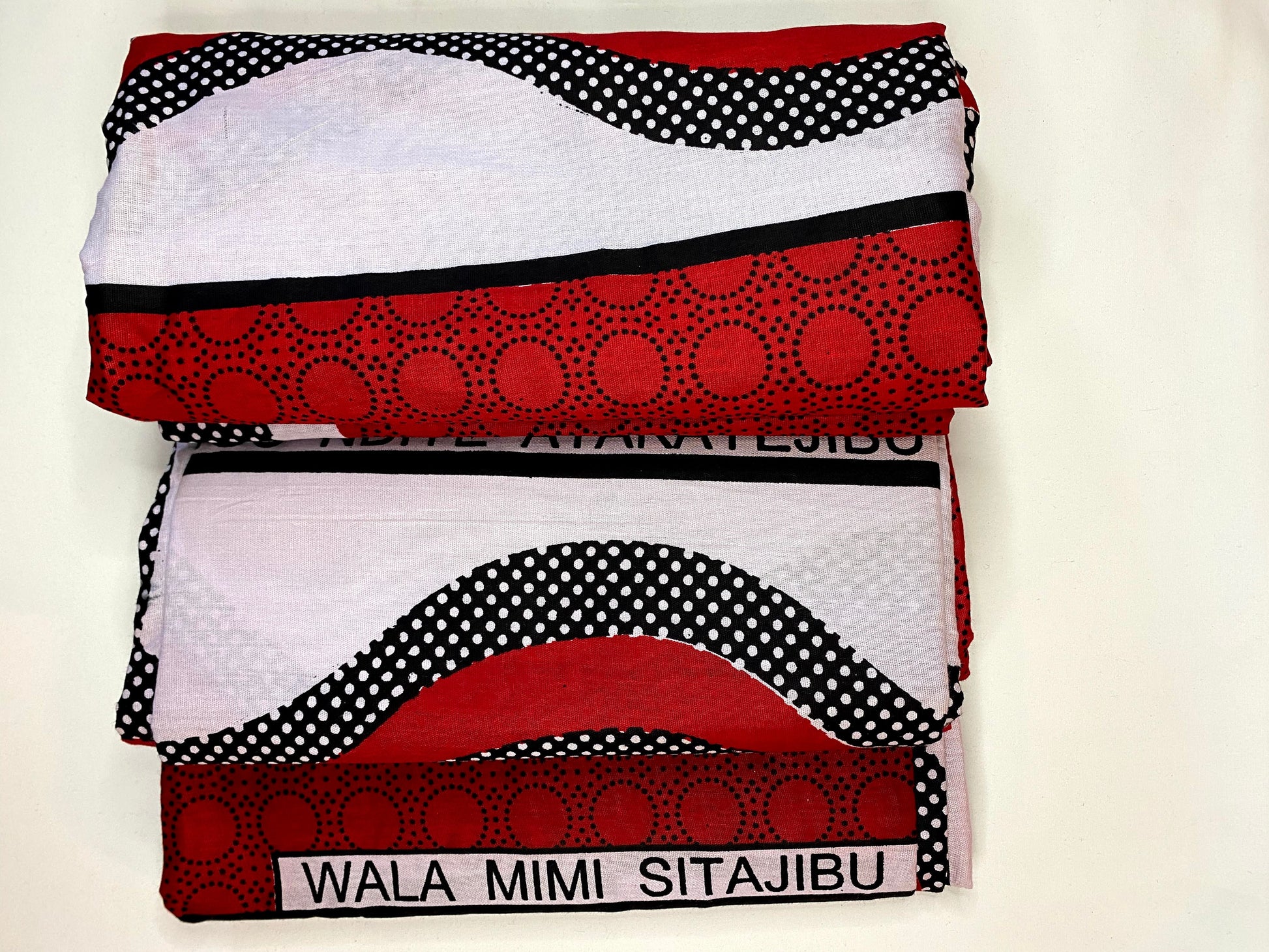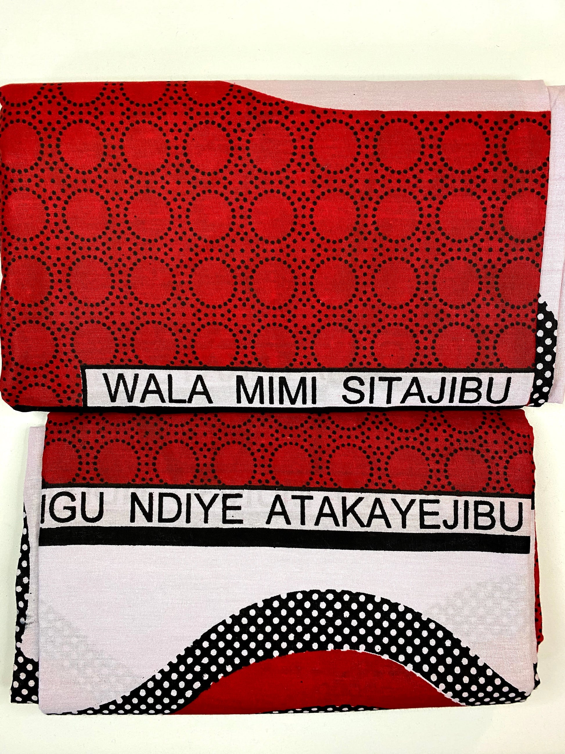 These sayings can range from messages of love, prosperity, and religion to just random things. This pair comes with a saying "Wala Mimi Sitajibu" which means "I will not respond". The only response needed is you stepping out in this red, black and white fabulous African print donning your already fabulous sense of self.